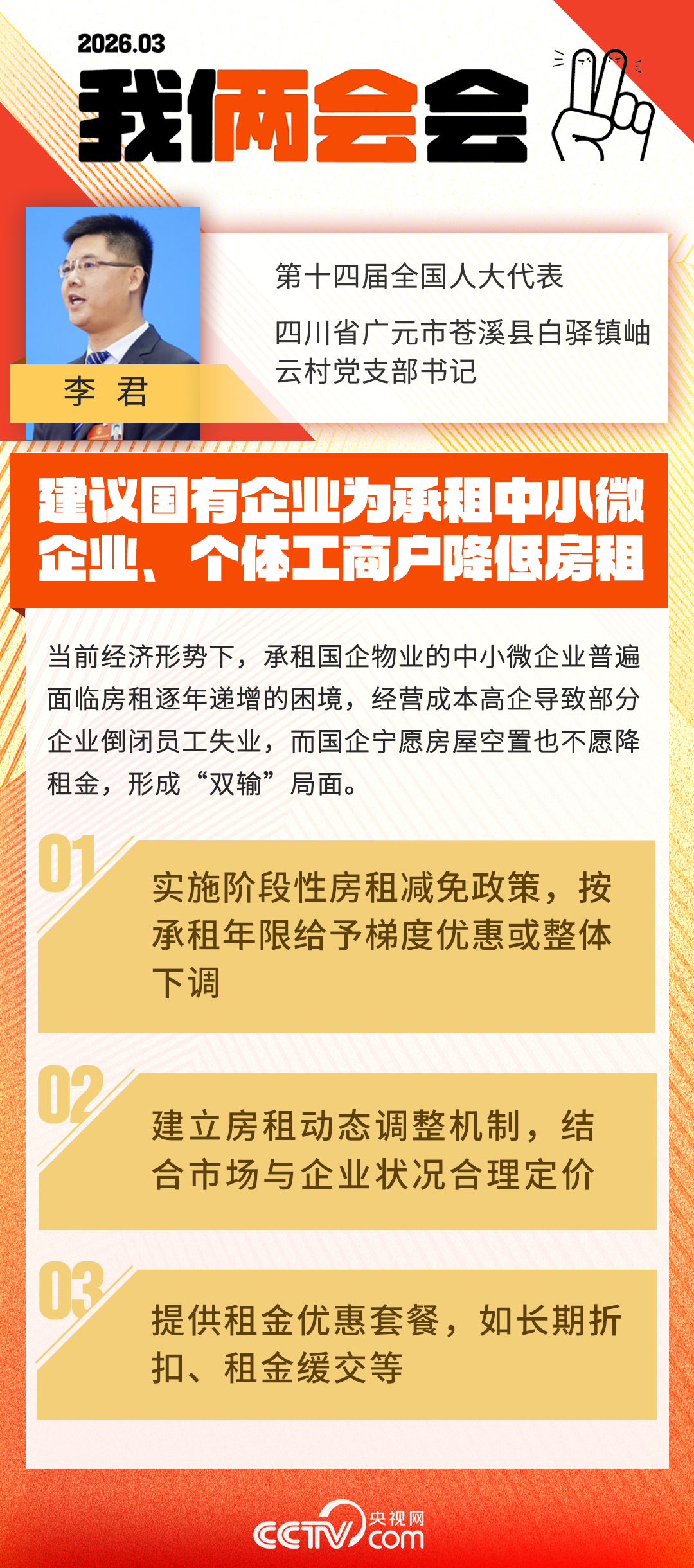全国人大代表、四川省广元市苍溪县白驿镇岫云村党支部书记李君表示,在当前经济形势下,承租部分国企物业的中小微企业和个体工商户普遍面临房租逐年递增的困境,经营成本高企导致部分企业倒闭员工失业,而有的国企宁愿房屋空置也不愿降租金,形成“双输”局面。