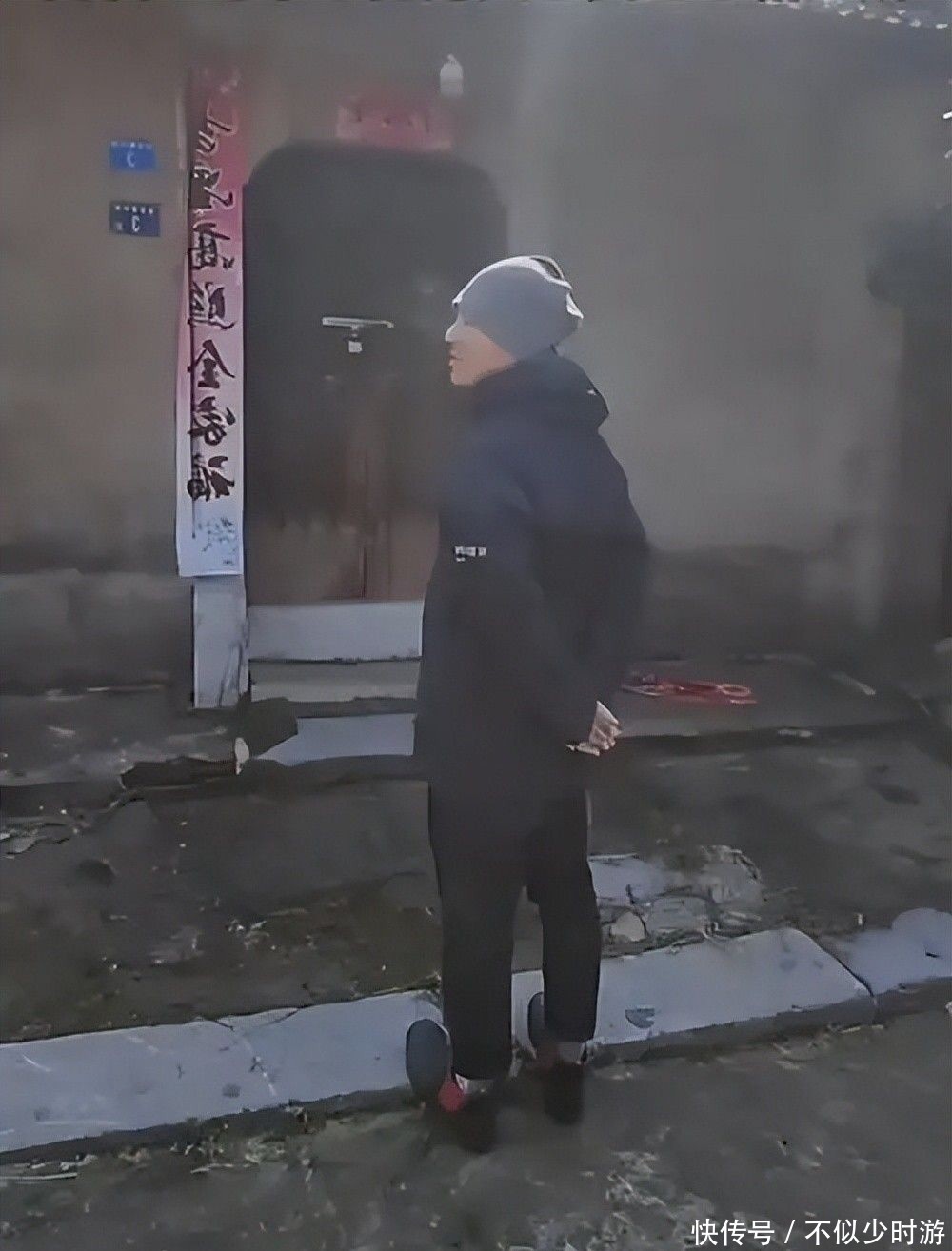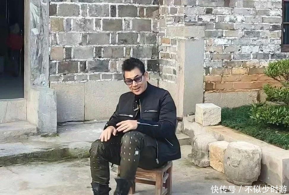 当天他身穿黑色拉链外套,内搭一件简约黑T恤,下身搭配灰色牛仔裤,脚踩黑色长筒靴,脸上架着一副黑框墨镜,坐在老屋前的小板凳上,神情放松,宛如邻家大哥般亲切自然。